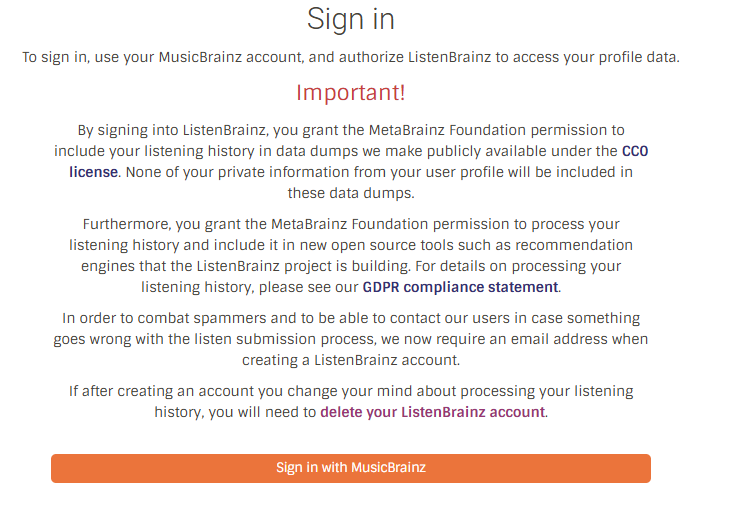 開くと「ListenBrainzに登録するっちゅーことは、アンタの再生履歴がどうなっちまうのか分かってんだろうね?」という旨のメッセージが出ます。同意できない場合はListenBrainzを使うことはできません。